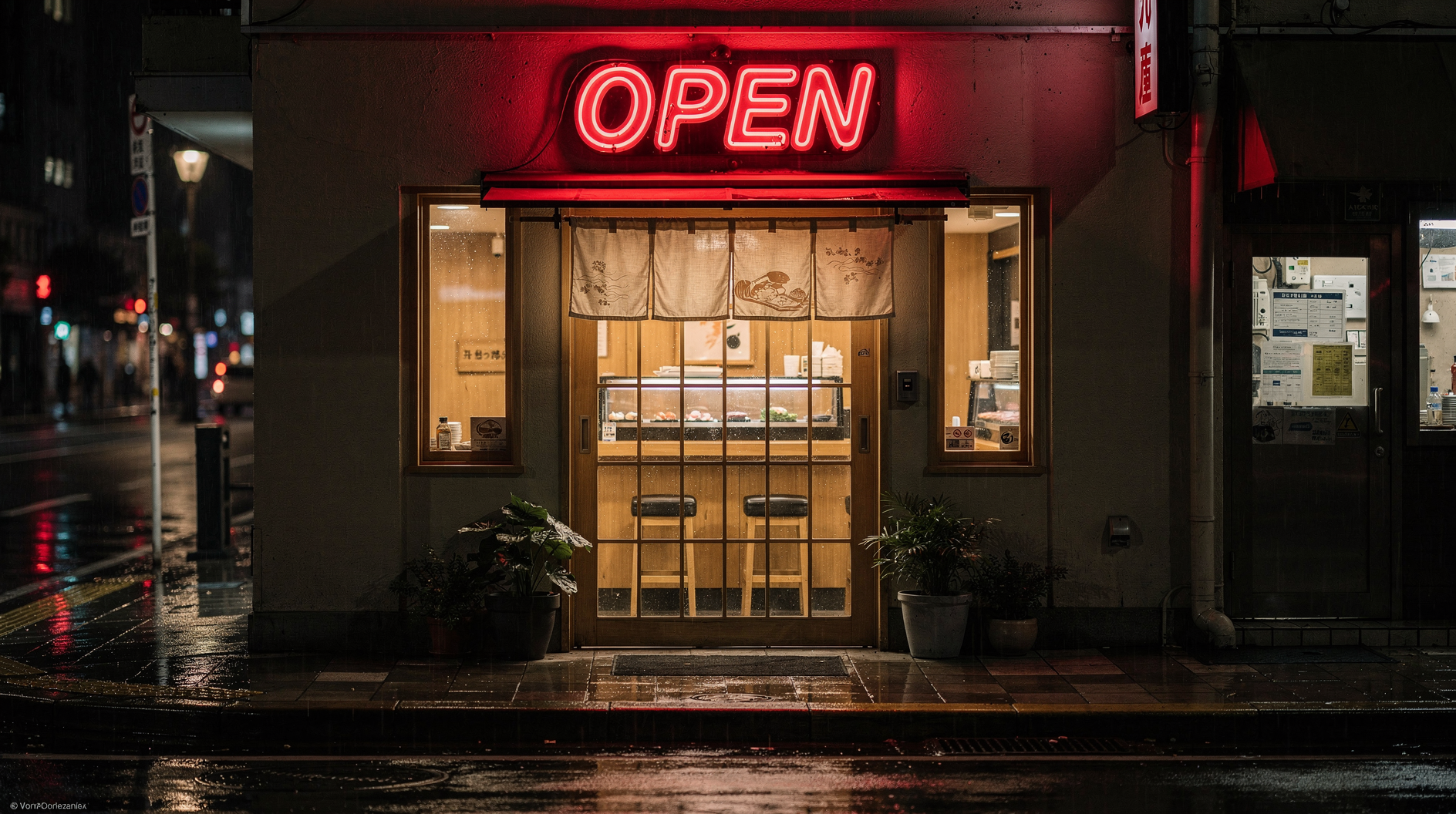 A Entry of a Sushi Restaurant, The text βOPENβ appears in red neon letters above the door