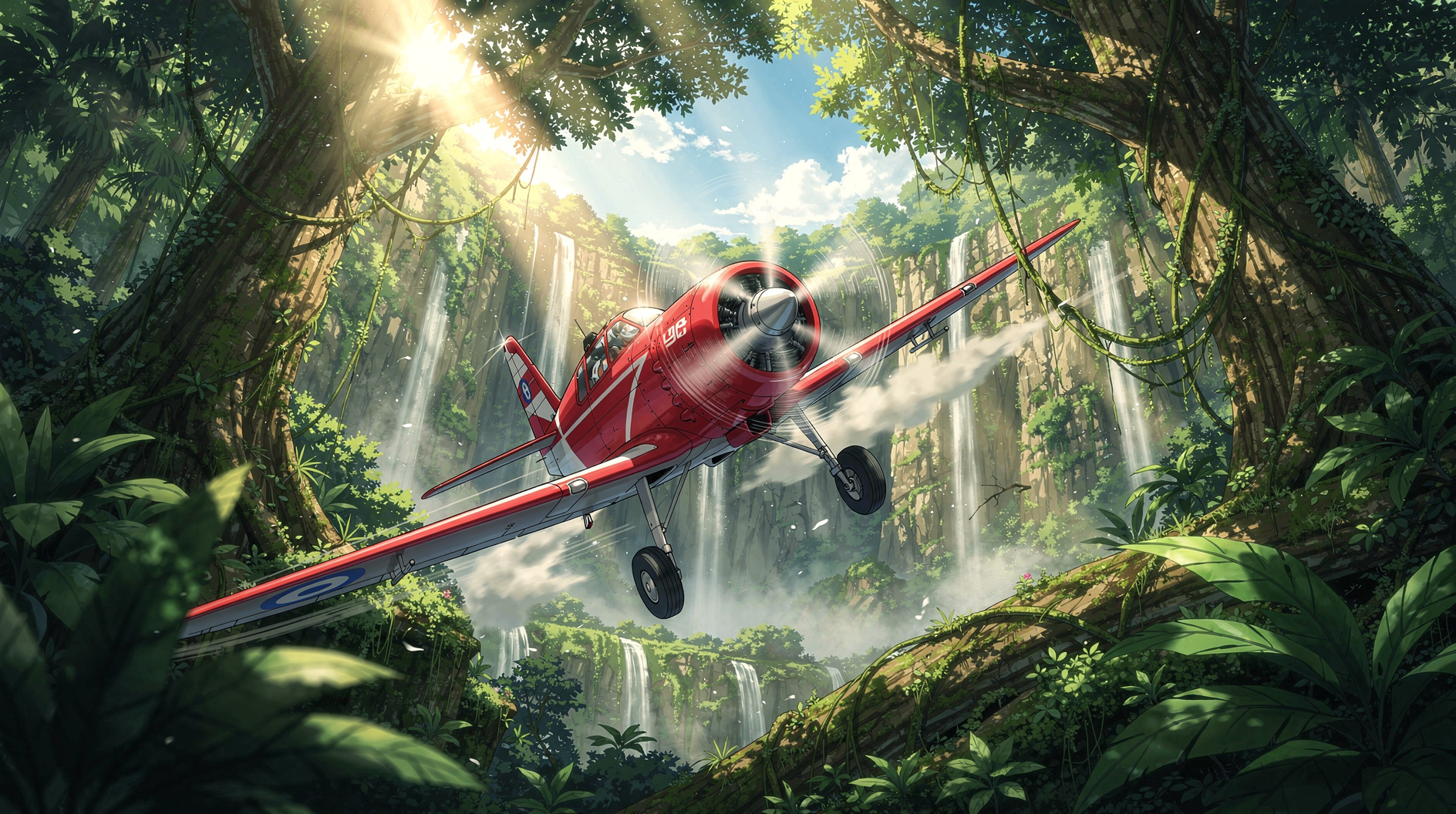 A small red propeller plane banking sharply between massive jungle trees in a bright anime style, with midday sun illuminating lush green foliage and waterfalls cascading in the background.